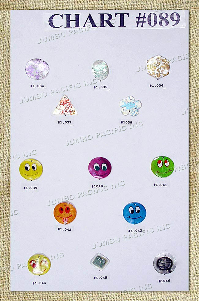 Hand printed MOP shells in various designs.